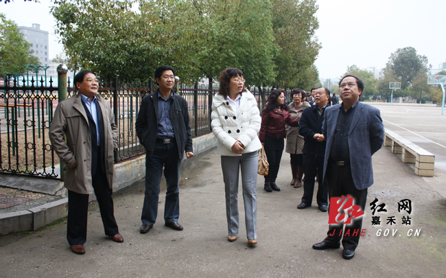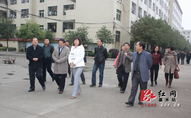 考察团在县委常委、宣传部长孙佑民的带领下参观嘉禾一中校园