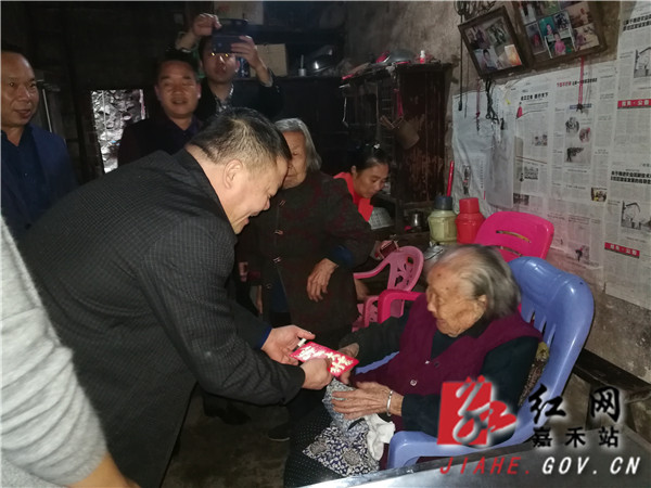 嘉禾网讯(通讯员 李小成)为了弘扬中华民族尊老、敬老、爱老、助老的传统美德,10月17日九九重阳节之际,嘉禾国家森林公园管理处主任、县林业局党组书记、局长雷知先先后到晋屏镇甫口村、长竹洞村、井塘村养老院、帅家社区、盘江大岭自然村走访慰问百岁老人和生活困难老人,给老人们送去节日的祝福和慰问金。