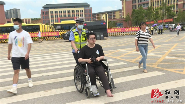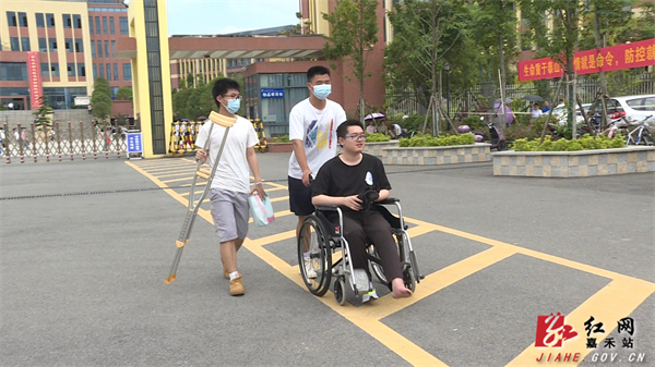 6月8日下午14时20分许,在嘉禾一中考点,一名考生在高考前夕摔伤了腿部,无法行走,在家长陪护下坐着轮椅来参加高考。因疫情防控和考试规定,家长不能随考生一并进入考场,但考生进入考点后还有一段路程,上下楼也不方便。了解情况后,在考点执勤的嘉禾县公安局交警大队交警迅速开辟绿色通道,并组织交警与现场的考生合力将受伤考生送进了考场。“你安心考试,考完后我们接你出来!”进考场前,交警面带笑容对考生说。