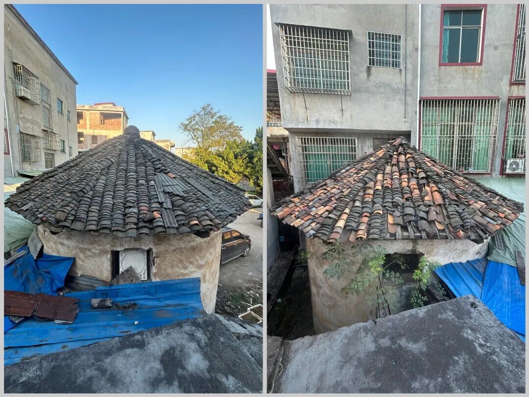 土圆仓的建筑特色。它的主体是圆筒形,用泥土混合稻草夯筑而成,直径大约3米,高约4米,墙体厚度约0.34米左右。仓房正中间开着一扇小门,左右两面墙上还各设了一扇小窗。最有韵味的是土圆仓的顶盖,采用的是八角攒尖顶设计,用木头做构架,上面铺满小青瓦。从顶上往下看,这个形状和嘉禾县城的珠泉亭特别相似,它把本土建筑元素巧妙地融了进去,满满的嘉禾风情。要是细看那些剥落的墙壁,还能发现这座土圆仓其实是用碎石和砖块垒砌而成,墙的里里外外都粉刷了一层石灰。