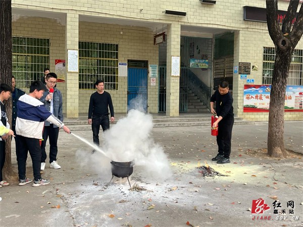 “一提二拔三瞄四压,身体与火源要保持一定的距离,对准火苗底部进行喷射。”演练结束后,教师就如何使用消防灭火器进行讲解示范。