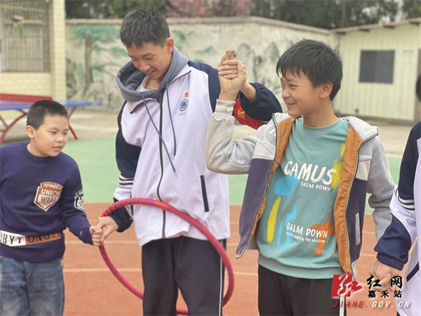 活动中,志愿者与县特殊教育学校的孩子们手牵着手在操场上游戏。志愿者还送上了牛奶、面包、体育器材等爱心物资,以实际行动传递爱心和温暖。