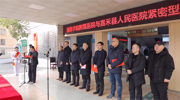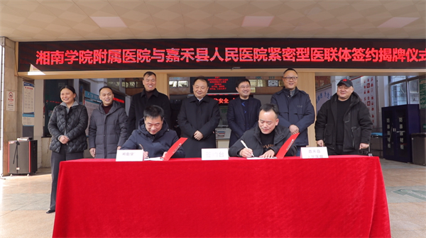 此后,湘南学院附属医院院长颜建辉与嘉禾县人民医院院长曹永福现场签定合作协议,副县长徐剑与附属医院党委书记谭东辉等领导为紧密型医联体单位揭牌。