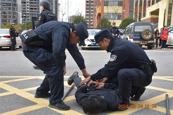 演练现场模拟了一名男子驾车闯入校园未果后,手持棍棒威胁师生安全的警情。校园安保人员手持钢叉拦截该男子,并迅速报警。接到警情后,钟水派出所、巡特警大队组织警力快速赶到现场,疏散周边师生,手持钢叉、橡胶棍、防暴盾牌将该男子团团围住,在对男子多次警告无效后,果断采用战术将其制服。至此,演练圆满结束。